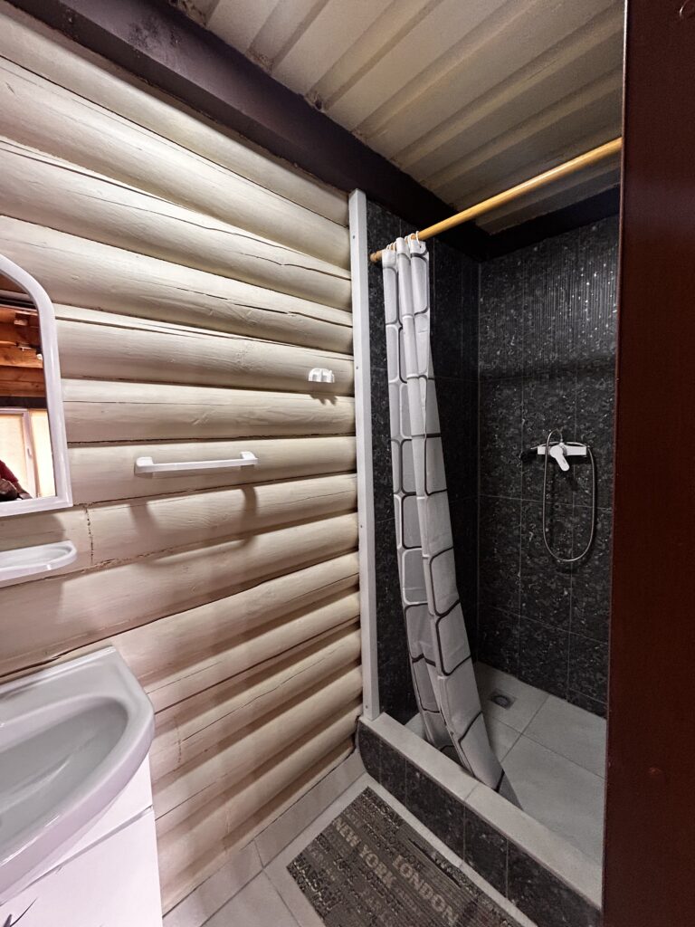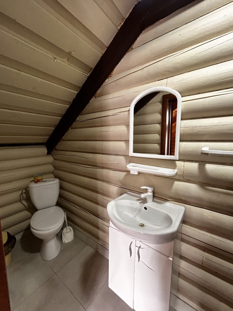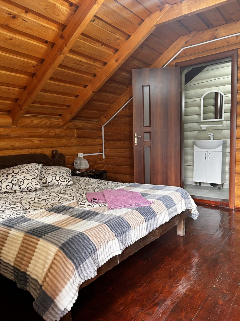 Двоповерховий будинок, на другому поверсі двоспальне ліжко, на першому вітальня – двоспальне та односпальне ліжка, телевізор, санвузол, міні кухня ( мікрохвильова піч, чайник).