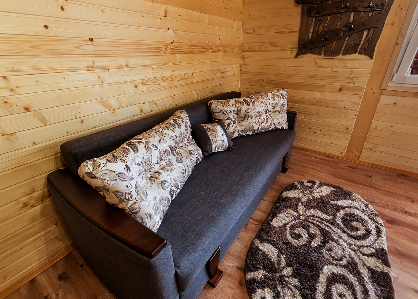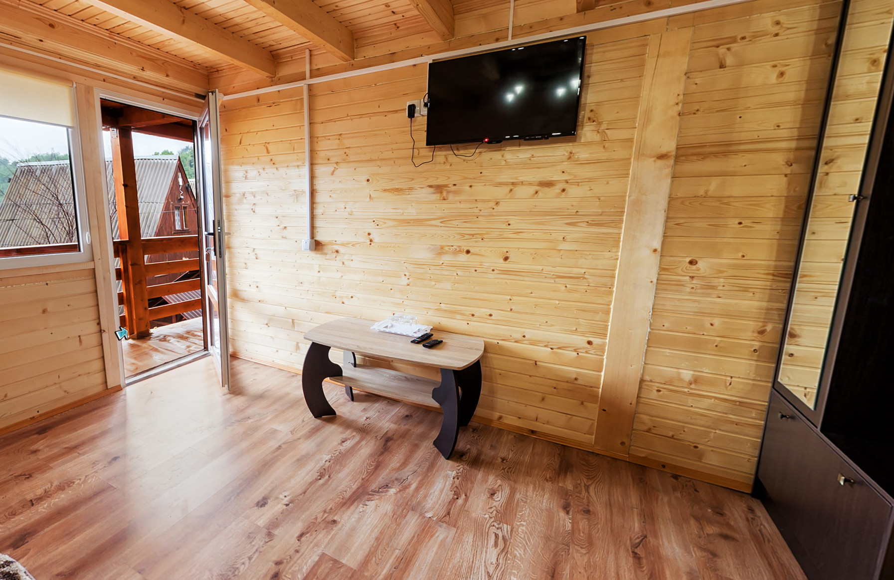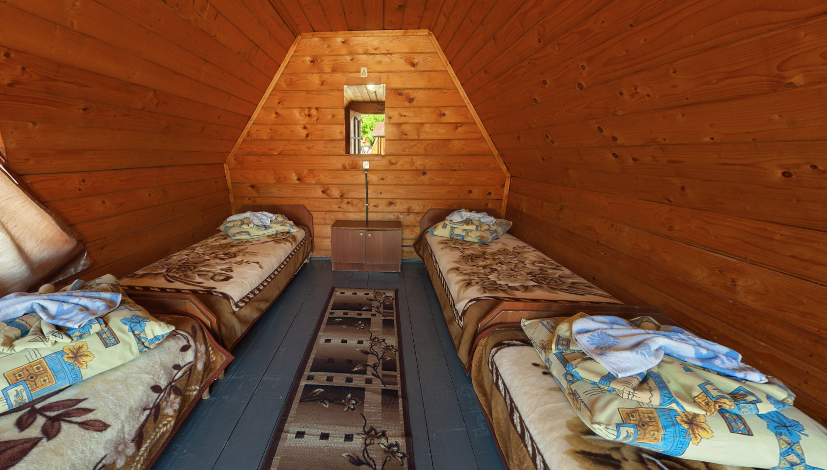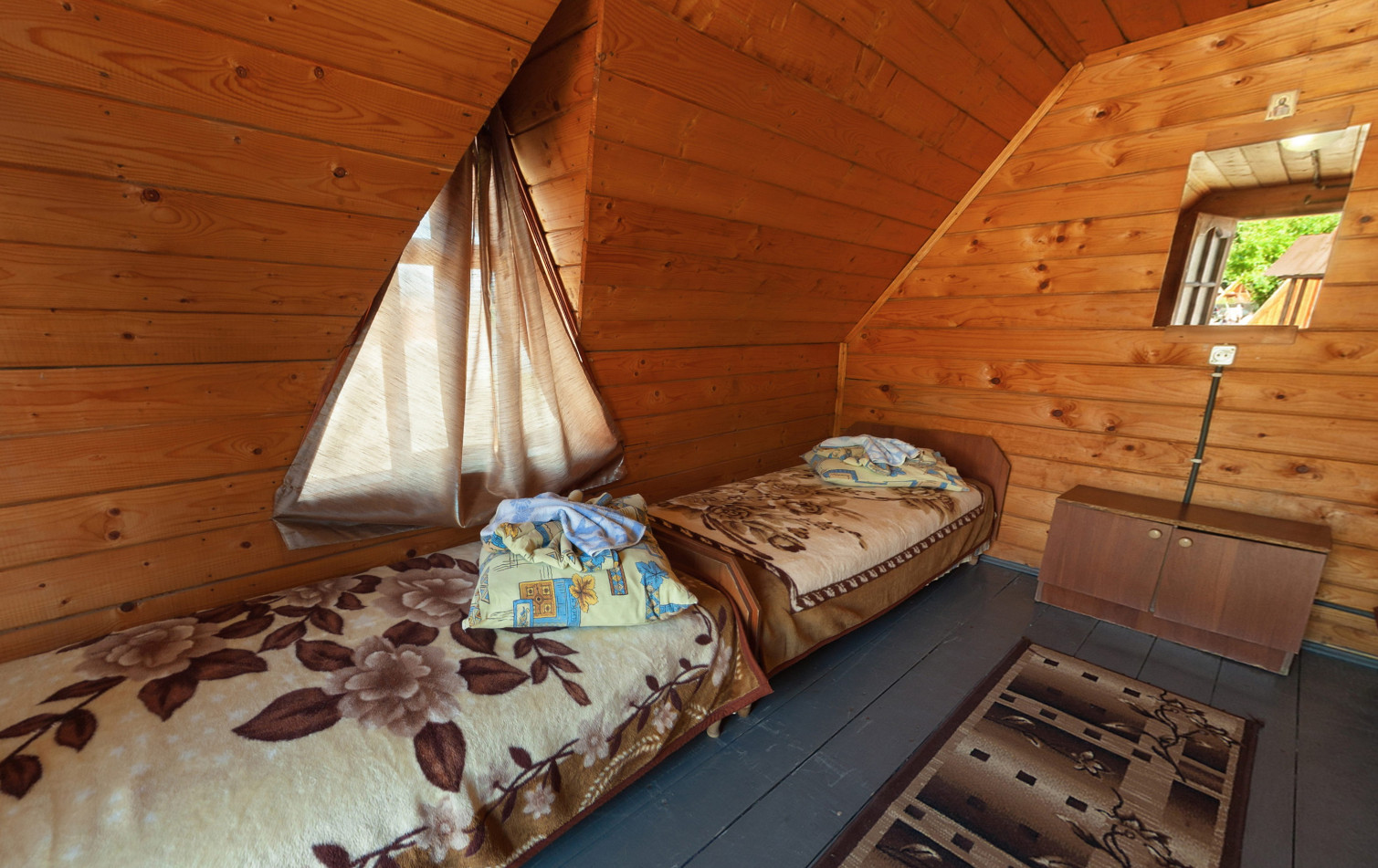 Двоповерховий будинок, на другому поверсі двоспальне ліжко, на першому вітальня – двоспальне та односпальне ліжка, телевізор, санвузол, міні кухня ( мікрохвильова піч, чайник).